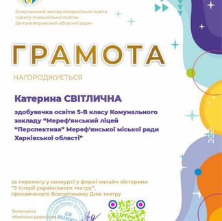 Учні нашого ліцею під керівництвом учительки історії Терещенко Олени Леонідівни взяли участь у конкурсі у формі онлайн-вікторини «З історії українського театру», присвяченому Всесвітньому Дню театру, який проводив Комунальний заклад позашкільної освіти «Центр позашкільної освіти» Дніпропетровської обласної ради.